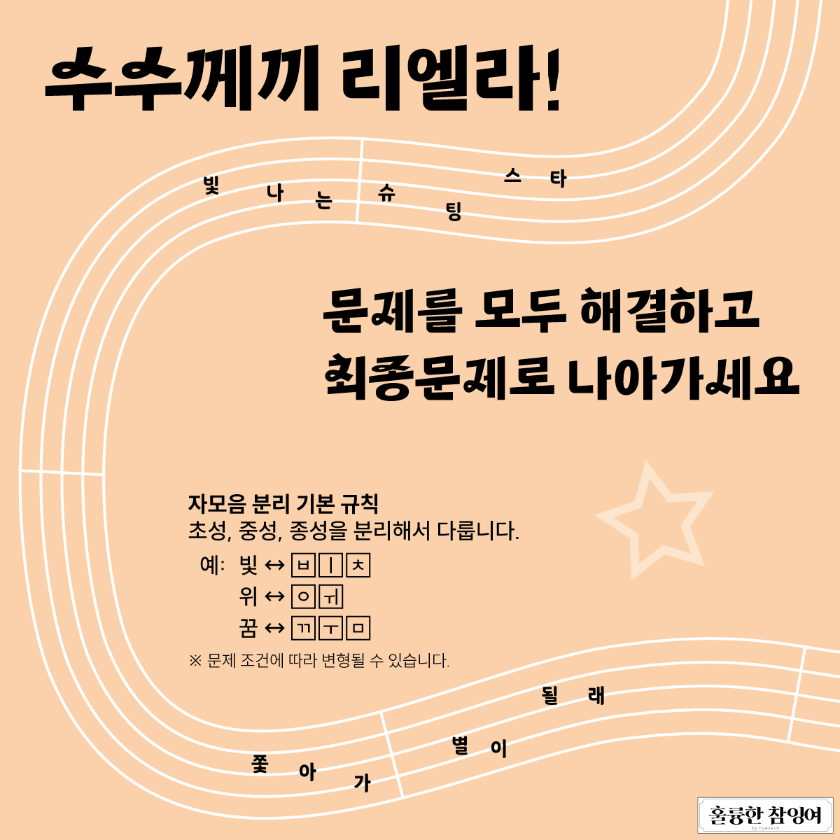 느낌표의 개수에서 러브라이브! 슈퍼스타!! 의 제목을 연상할 수 있다면, 각 상자는 자모음의 결합을 표현한 것이라는 것도 알 수 있을 것입니다.